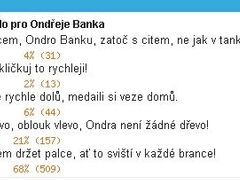 Na pondělí vybírali čtenáři heslo pro obří slalom můžů pro Ondřeje Banka. Vyhrál slogan "Ondro, budem držet palce, ať to sviští v každé brance!" .